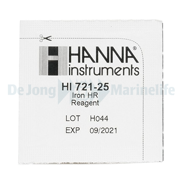 The HI-721-25 are high-quality reagents that are pre-measured, allowing for users to achieve fast and accurate measurements with their Iron CheckerĀ® HC. These reagents follow the Phenanthroline Method in which the reaction between iron and reagent causes an orange tint in the sample. By simply adding the packet of HI-721-25 reagent to the sample, the reaction will take place and the HI-721 will determine the concentration from the colour that is produced. The results will be displayed in ppm (mg/L) of iron. These reagents are designed to be used with samples that have an expected range of 0.00 to 5.00 ppm (mg/L) iron.